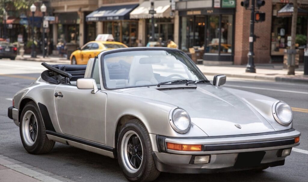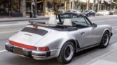 Equipped with air-cooled 3.2-liter flat-six engine, 5-speed G50 manual transmission, single exhaust outlet, four-wheel disc brakes, VDO instrumentation, convertible soft top, Bosch Lighting package, Bosch branded fog lights, rear rubber bumperettes, 4-spoke steering wheel, 16-inch Fuchs-style wheels, Goodyear tires, and a spare tire fitted in the front trunk. Convenience features include air conditioning, power-adjustable sports seats, FM/AM, analog clock, and dual-side rearview mirrors.